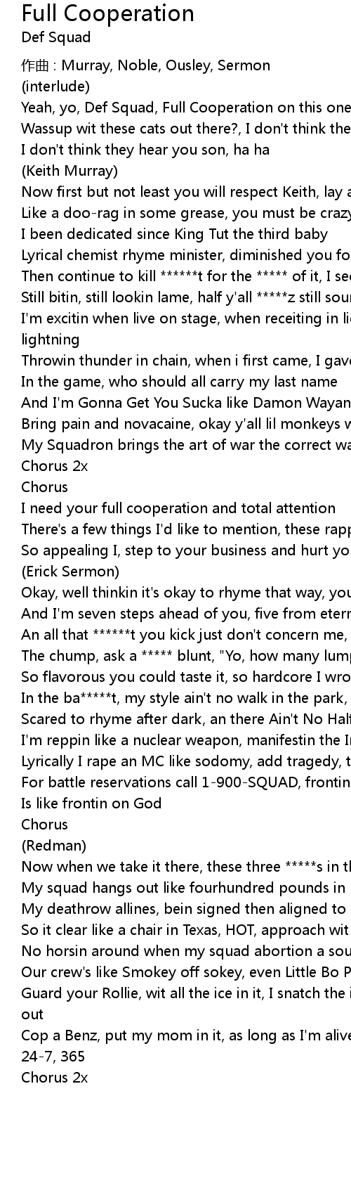 | Yeah, yo, Def Squad, Full Cooperation on this one yo, total concentration | |