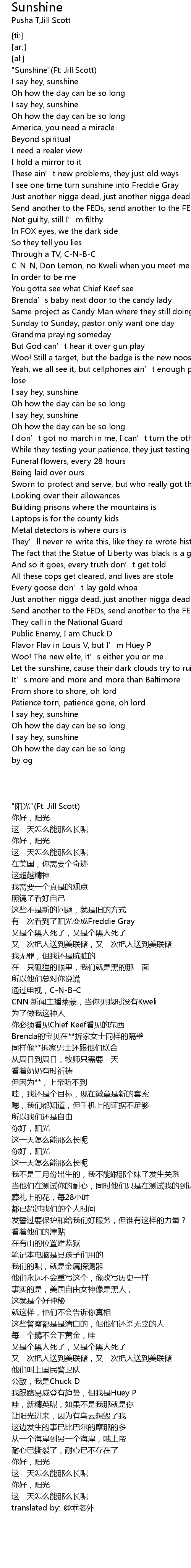 | [00:27.08] | I see one time turn sunshine into Freddie Gray |