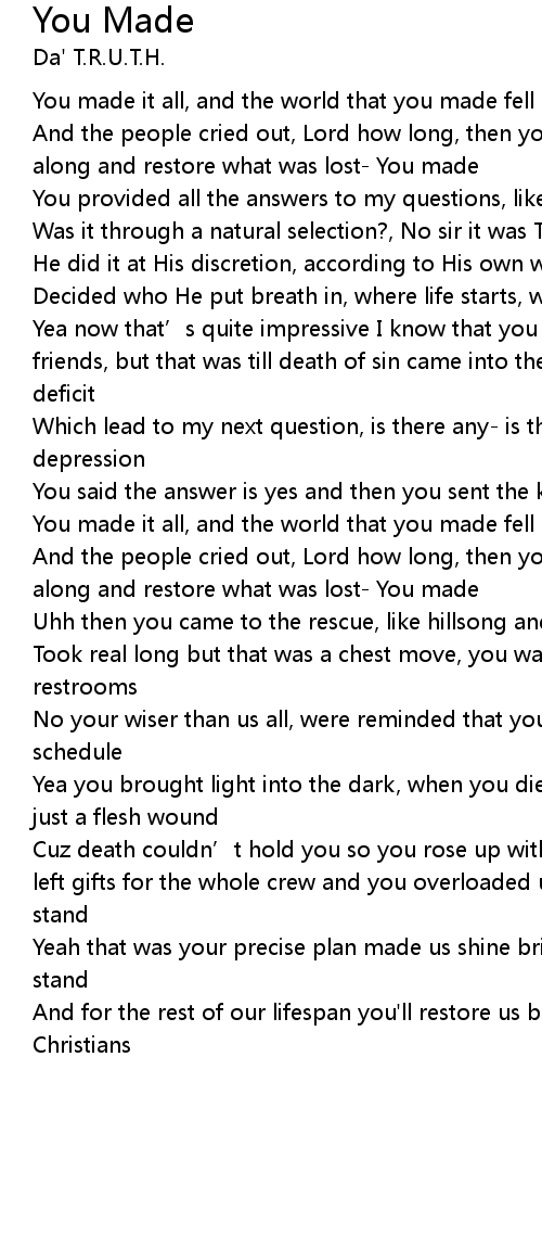 | And the people cried out, Lord how long, then you sent the redeemer to come along and restore what was lost- You made | |