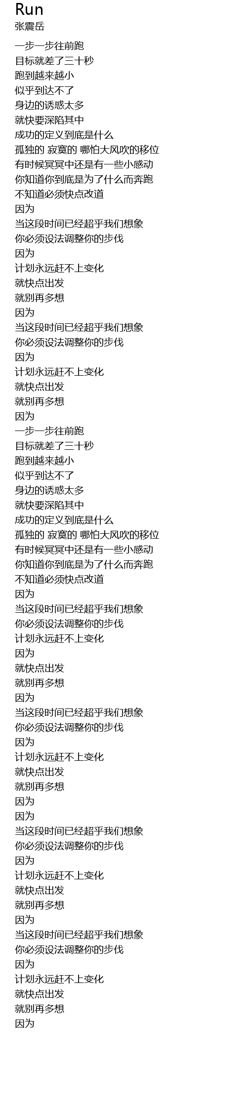 | [00:43.120] | nǐ zhī dào nǐ dào dǐ shì wèi le shén me ér bēn pǎo |