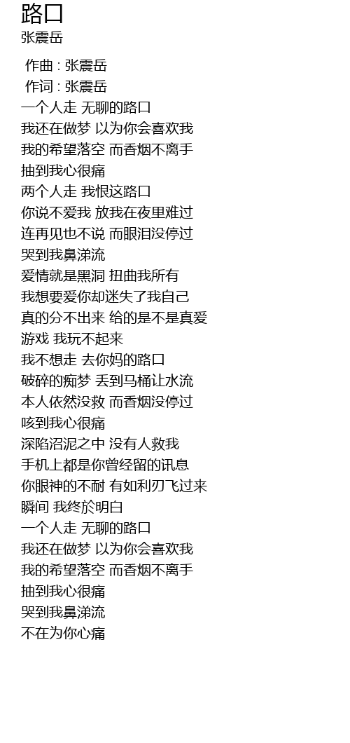 | [01:34.868] | 我不想走 去你妈的路口 |