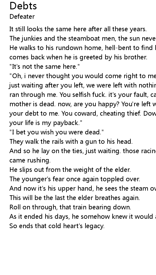 | "Oh, i never thought you would come right to me. I've spent years on these docks just waiting after you left, we were left with nothing. Every day what you did ran through me. You selfish fuck. it's your fault, can't you see? Your addict mother is dead. now, are you happy? You're left with nothing. now. You'll pay your debt to me. You coward, cheating thief. Down at those long steel tracks, your life is my payback." | |