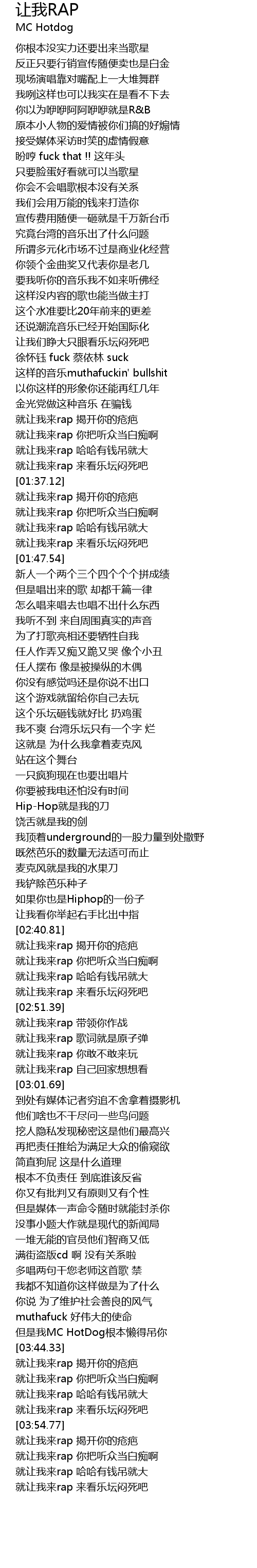 | [03:41.31] | 但是我MC HotDog根本懒得吊你 |