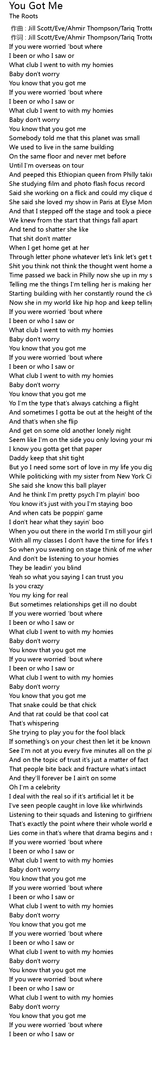 | [00:00.493] | 作词 : Jill Scott/Eve/Ahmir Thompson/Tariq Trotter/Scott Storch |