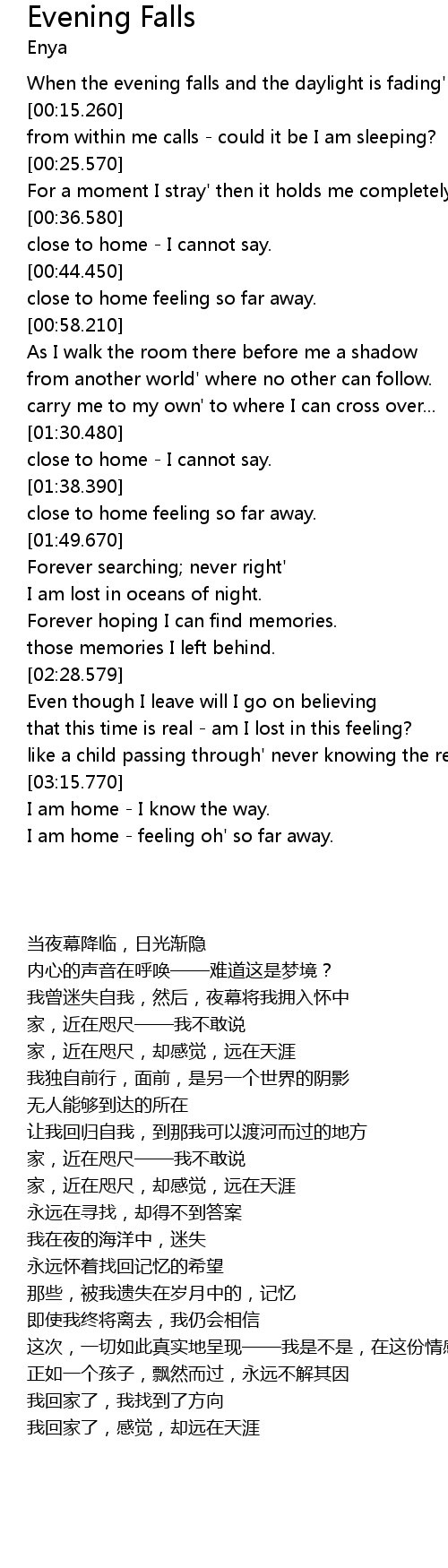 | [00:04.700] | When the evening falls and the daylight is fading' |