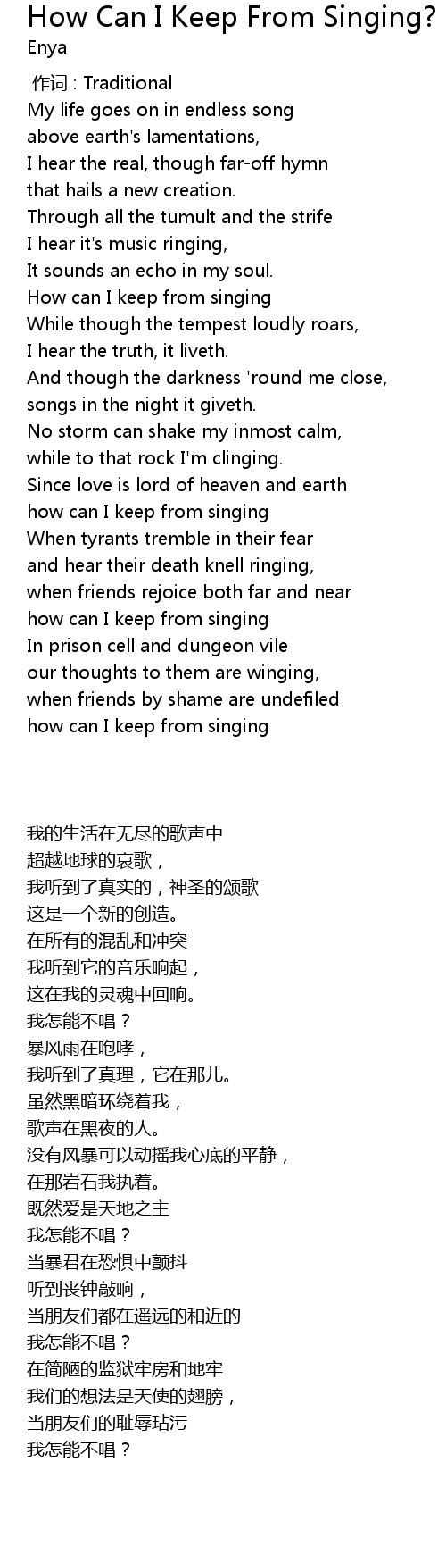 | [02:01.20] | how can I keep from singing |