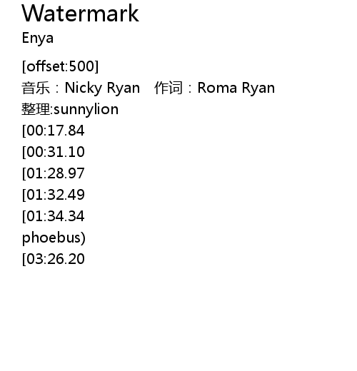 | [00:07.38] | yīn yuè: Nicky Ryan zuò cí: Roma Ryan |