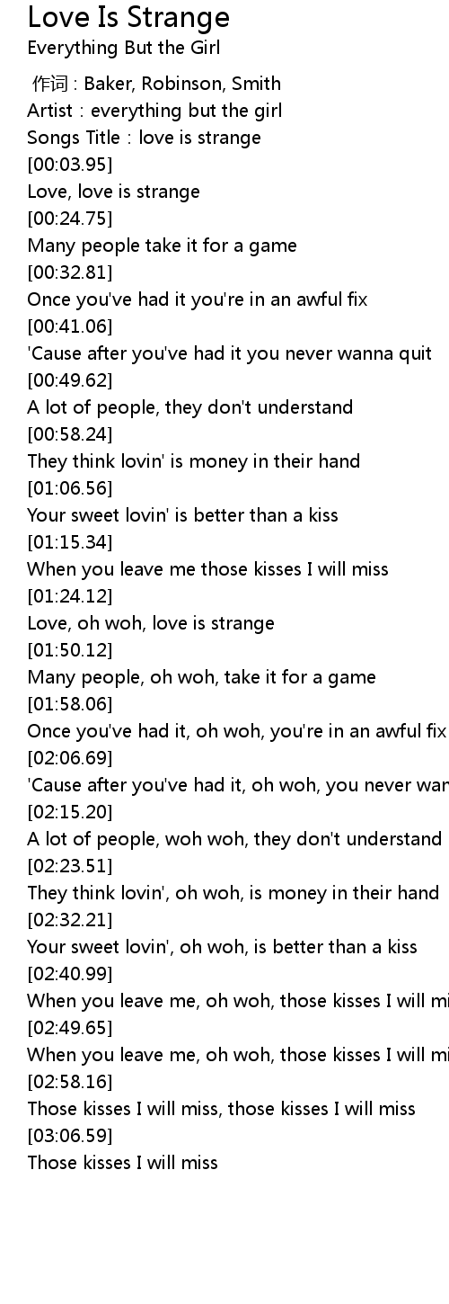 | [01:43.37] | Love, oh woh, love is strange |