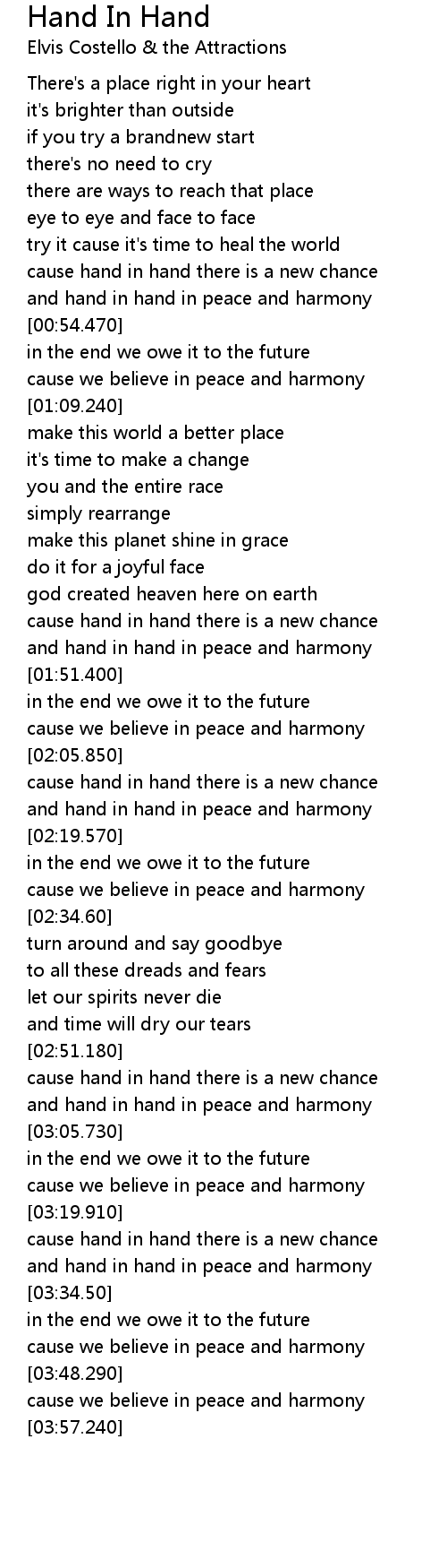 | [03:00.170] | and hand in hand in peace and harmony |