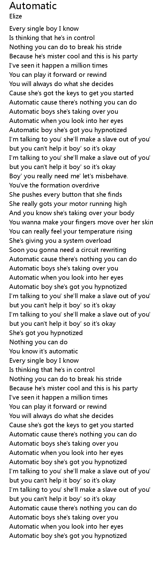 | [01:19.496] | Automatic boys she' s taking over you |