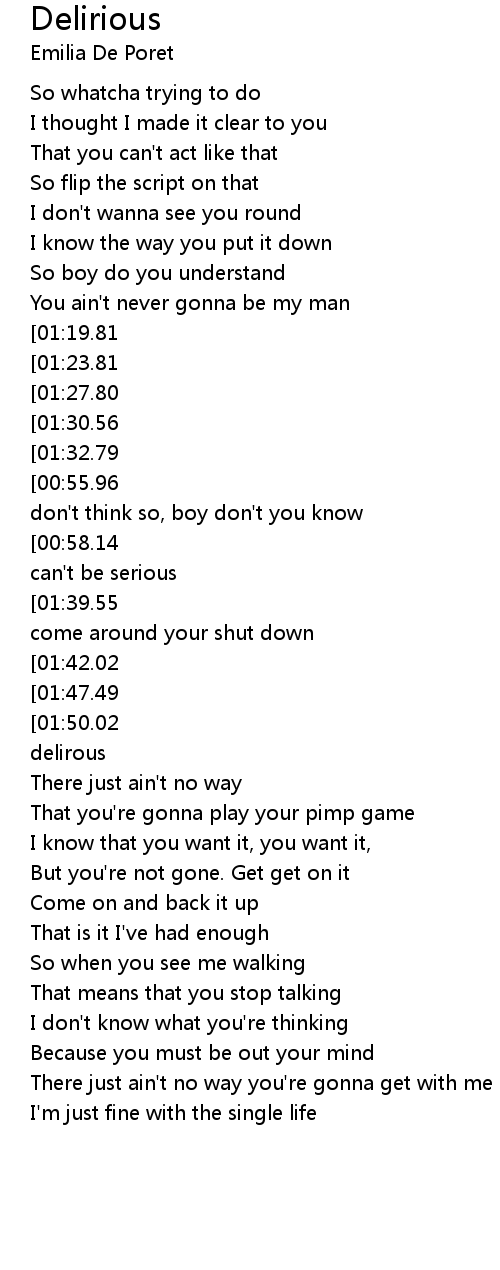 [01:01.06][01:50.02][02:12.97][02:21.12][02:29.67][02:37.32][02:45.85][02:53.06] Your delirous