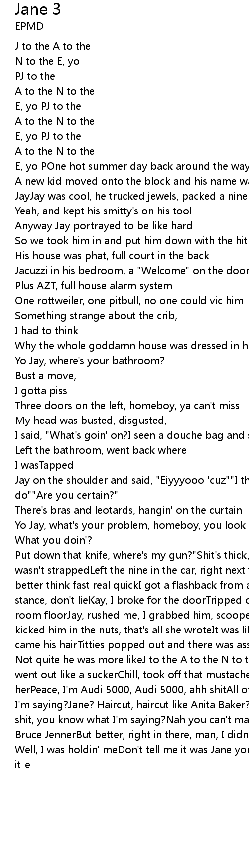 Put down that knife, where's my gun?"Shit's thick, I reached for my tool, I wasn't strappedLeft the nine in the car, right next to the Jim HatIt's my ass, I better think fast real quickI got a flashback from a Bruce Lee flickGot in my stance, don't lieKay, I broke for the doorTripped on some bullshit in the living room floorJay, rushed me, I grabbed him, scooped him up in the yokeAhh shit, kicked him in the nuts, that's all she wroteIt was like rapunzelRapunzel? Down came his hairTitties popped out and there was ass everywhereJay a transvestite? Not quite he was more likeJ to the A to the N to the E, yo PDon't tell me, you went out like a suckerChill, took off that mustacheGrabbed that ass and I fucked herPeace, I'm Audi 5000, Audi 5000, ahh shitAll of that real shit, you know what I'm saying?Jane? Haircut, haircut like Anita Baker?The whole shit, yo, the whole shit, you know what I'm saying?Nah you can't man, I ran right up in her like Bruce JennerBut better, right in there, man, I didn't even careAre you crazy? Well, I was holdin' meDon't tell me it was Jane you were juicin'Sheiit, kick it-e |