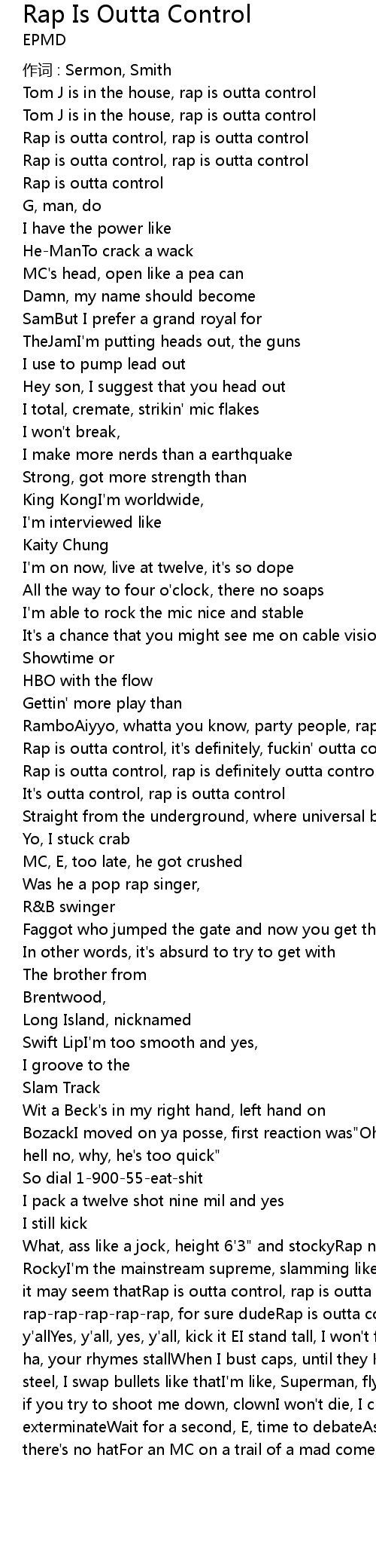 | What, ass like a jock, height 6'3" and stockyRap name not Balboa, so motherfuck RockyI'm the mainstream supreme, slamming like Aikeem the DreamAnd yes sometimes it may seem thatRap is outta control, rap is outta controlSure dude, rap-rap-rap-rap-rap, for sure dudeRap is outta control, yes, yes, y'all, yes, y'allYes, y'all, yes, y'all, kick it EI stand tall, I won't fall, I recall, ha ha, your rhymes stallWhen I bust caps, until they Kryptonite capsI reign of steel, I swap bullets like thatI'm like, Superman, fly high way up in the skyAnd if you try to shoot me down, clownI won't die, I cremateI hate, let's exterminateWait for a second, E, time to debateAs I take my fisherman hat off, there's no hatFor an MC on a trail of a mad comeback |