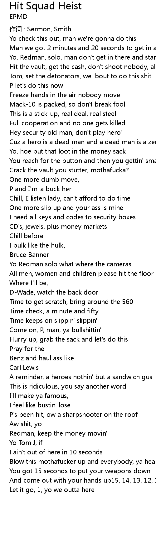 | Hit the vault, get the cash, don' t shoot nobody, alright? | |
