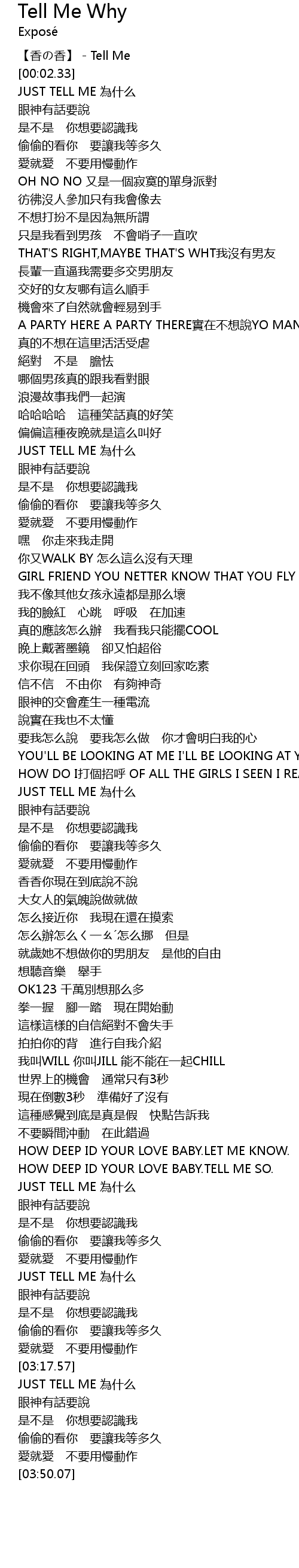 | [03:31.72] | JUST TELL ME wèi shén me |