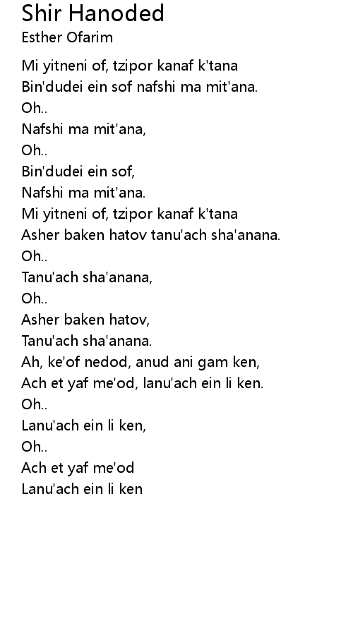 | Mi yitneni of, tzipor kanaf k'tana | |