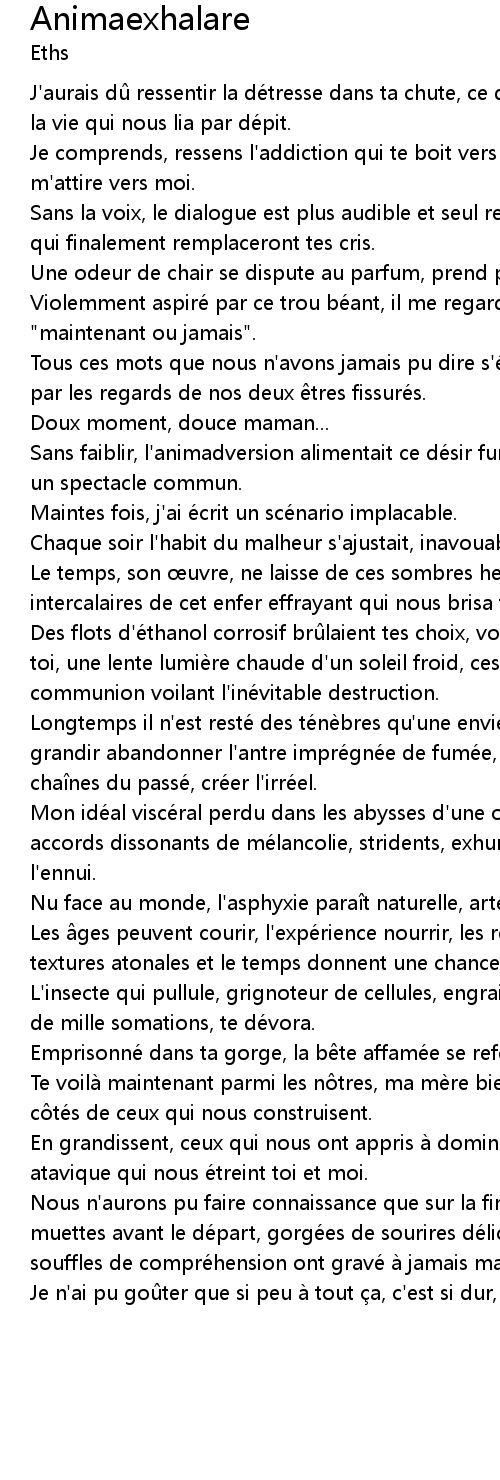 | Des flots d'e thanol corrosif br laient tes choix, voila ce qu' il me reste de toi, une lente lumie re chaude d' un soleil froid, ces rares instants profonds de communion voilant l' ine vitable destruction. | |