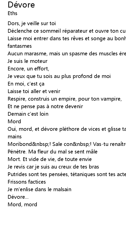 | Oui, mord, et dé vore plé thore de vices et glisse ta faim en pré mices de tes mains | |