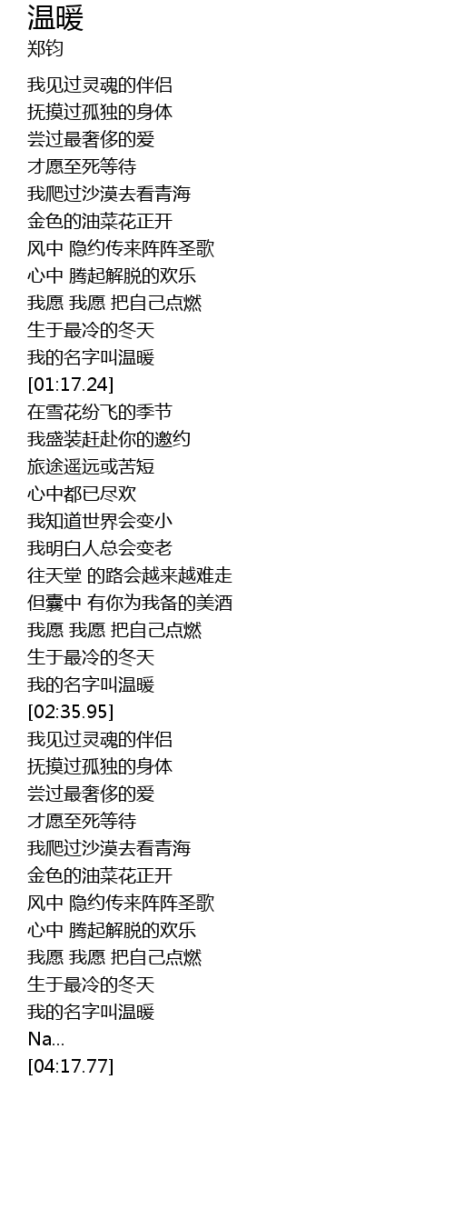 | [01:13.31] | 我的名字叫温暖 |